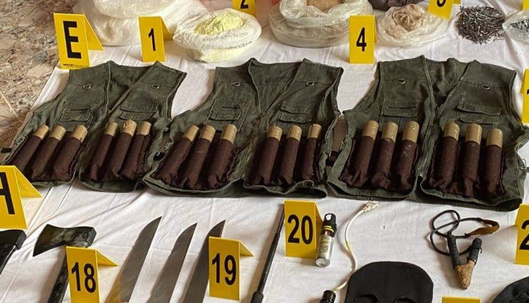وأشار المكتب المركزي إلى أن إجراءات التفتيش وعمليات المسح والتمشيط التي أجريت في محلات وشقق كان يستغلها المشتبه فيهم كأماكن آمنة وكقاعدة خلفية للدعم اللوجستيكي، أسفرت عن حجز ثلاثة أحزمة ناسفة، تحتوي على مجوفات لولبية لتحميل الأجسام المتفجرة، و15 قنينة تحتوي على مواد ومشتملات كيميائية مشبوهة، وصاعقين كهربائيين، ومعدات إلكترونية، ومساحيق كيميائية وأسلاك كهربائية، وثلاثة أقنعة حاجبة للمعطيات التشخيصية، ومنظارين، ومعدات إلكترونية وكهربائية للتلحيم، وكاميرا رقمية متطورة، وقنينتين للغاز المسيل للدموع، ومجموعة كبيرة من الأسلحة البيضاء من أحجام مختلفة، وقنينات غاز من الحجم الصغير، وطنجرتين للضغط مملوءتين بالمسامير والأسلاك وأخرى تحتوي على سائل كيميائي مشبوه، علاوة على عدة حقائب بلاستيكية تحتوي على لولبات حديدية ومواد مشبوهة، وخمس بطاريات للشحن، و25 مصباحا كهربائيا.