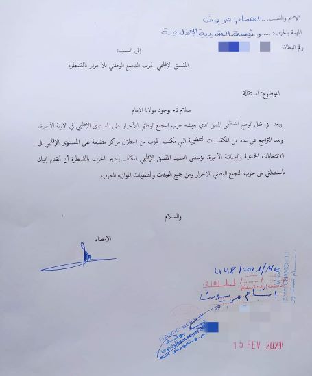 قدمت رئيسة الشبيبة الإقليمية لحزب التجمع الوطني للأحرار بالقنيطرة، استقالتها الاثنين 15 فبراير الحالي، من جميع هياكل حزب الحمامة وتنظيماته الموازية