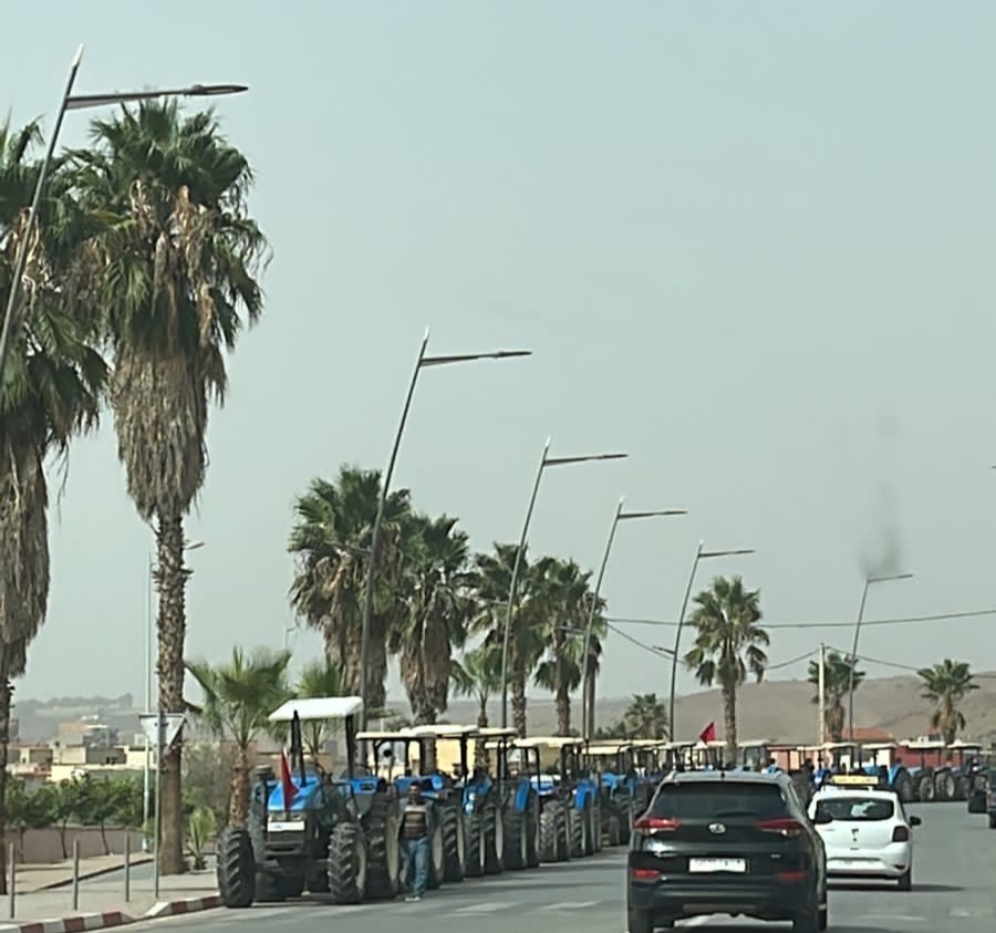 الوقفة الإحتجاجية بالجرارات غير مرخصة واغلب الجرارات ليس لها تأمين تمر بالطريق الرئيسية لإنجاح الإضراب لفائدة البرلماني رحو الهيلع وأتباعه معروفوم أمام أنظار السلطات المحلية بأنهم لهم شعبية إنتخابية ضيقة والإرتزاق على جيوب الفلاح المغلوب على أمره دو الحشمة والحياء .. أمام المهازل في دائرة الرماني للبرلماني وحزبه مشارك في الحكومة يحتج بطريقة غير شرعية وهو مستفيد من الريع بكل المقاييس في جل أراضي الدولة ولم يؤدي ولو سنتيم يتهرب عن السداد الشعير المدعم في الآلات الفلاحية التنمية البشرية القرض الفلاحي بدون حسيب ولا رقيب عوضآ يكون بجانب السلطات المحلية لفك الإعتصام بوعود وإيصال صوت الفلاح إلى الجهات بطريقة حضارية هو من يحتج”