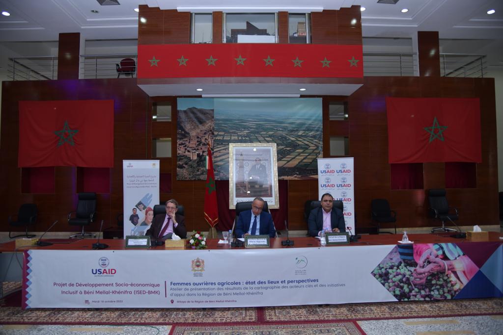 نظم مشروع التنمية الاجتماعية و الاقتصادية الدامجة بجهة بني ملال خنيفرة الممول من الوكالة الأمريكية للتنمية لقاءا لعرض نتائج تشخيص من طرف خبراء خواص شمل تقديم دراسة لعرض نتائج التشخيص خريطة الفاعلين الاساسيين و المبادرات الداعمة لظروف عيش و عمل النساء العاملات في القطاع الفلاحي بجهة بني ملال .