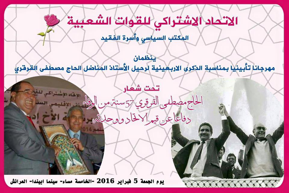 بمناسبة الذكرى الاربعينية لرحيل الفقيد الكبير الحاج مصطفى القرقري. ينظم الاتحاد الاشتركي للقوات الشعبية وعائلة الفقيد مهرجانا خطابيا يوم الجمعة 05 فبراير 2016 ابتداء من الساعة الخامسة مساء بقاعة سينيما ابينيدا بالعرائش برئاسة الكاتب الأول للحزب ادريس لشكر، وسيعرض في المناسبة شريط وثائقي عن الفقيد، ويقدم بعض أصدقائه شهادات عن مسيرة الرجل.