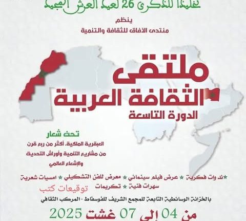 ينظم منتدى الآفاق للثقافة والتنمية بمدينة خريبكة، فعاليات الدورة التاسعة لملتقى الثقافة العربية من 4 إلى 7 غشت 2025، تخليدا للذكرى السادسة والعشرين لعيد العرش المجيد.