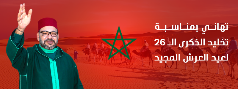 بمناسبة عيد العرش المجيد الذي يخلّد الذكرى السادسة والعشرين لاعتلاء صاحب الجلالة الملك محمد السادس نصره الله عرش أسلافه الميامين، يتشرف السيد منير ليموري، عمدة مدينة طنجة، أصالة عن نفسه ونيابة عن عضوات وأعضاء المجلس الجماعي لطنجة وكافة موظفي الجماعة الحضرية، بأن يرفع إلى المقام العالي بالله أسمى عبارات التهاني وأصدق آيات الولاء والإخلاص بهذه المناسبة الوطنية المجيدة.