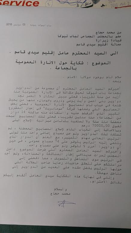 في شكاية موجهة لابراهيم ابو زيد عامل اقليم سيدي قاسم ، تطرق محمد حجاج ،أحد أعضاء المعارضة بالجماعة الترابية لباب تيوكة، إلى أهم المشاكل التي تعاني منها مجموعة من دواوير الجماعة ، وعلى رأسها الغياب التام للإنارة العمومية .
