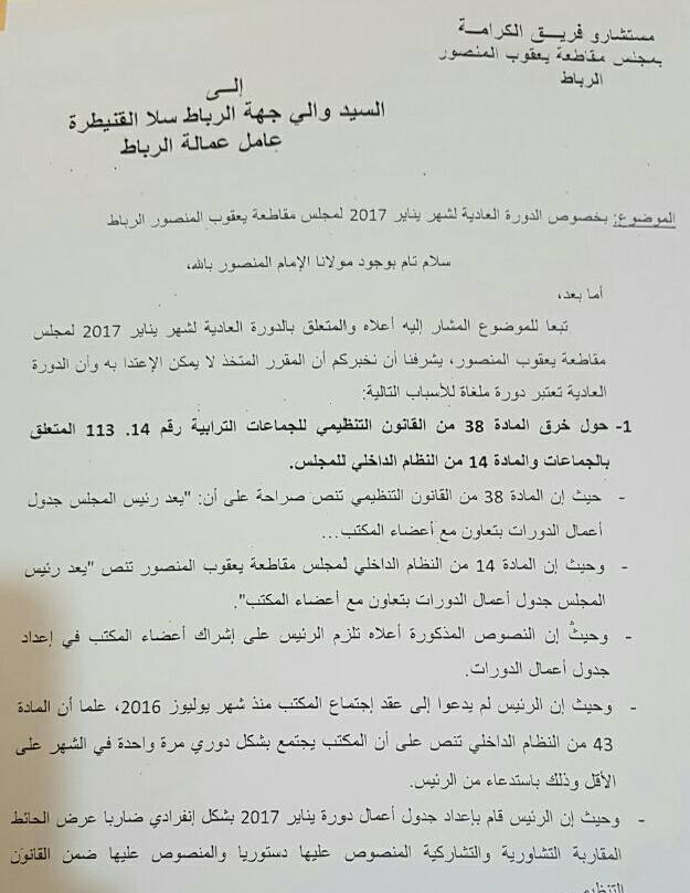 احتج مستشارون بمجلس جماعة يعقوب المنصور بالرباط على عدم شرعية وقانونية انعقاد دورة يناير للمجلس والذي  يرأسه القيادي في حزب العدالة والتنمية  المدني.