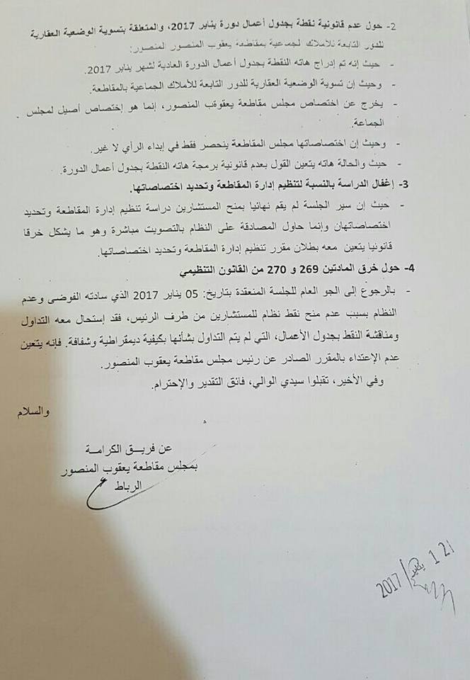 وراسل مستشارو فيرق الكرامة بمجلس مقاطعة يعقوب المنصور بالرباط والي جهة الرباط سلا عامل عمالة الرباط لاحتجاج على ذلك.