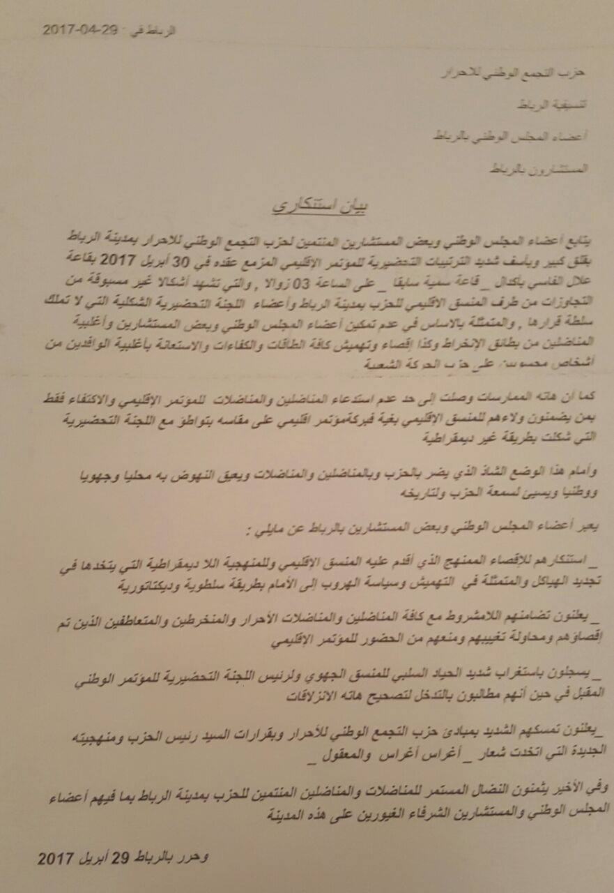 قال اعضاء المجلس الوطني لحزب التجمع الوطني للاحرار ومستشارون بالرباط في بلاغ استنكاري توصل به ” سياسي” انهم ينددون باقصائهم من المؤتمر الاقليمي ليوم 30 ابريل، للرباط وينددون كذلك بطريقة تحضير للمؤتمر من قبل المنسق الاقليمي والجهوي عبد القادر تاتو وسعد بنمبارك.