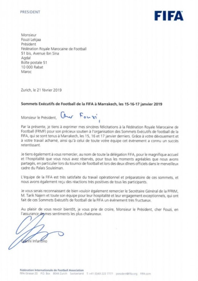 وثيقة : رئيس الفيفا تايشكر فوزي لقجع ! رياضة بتاريخ فبراير 22, 2019 مشاركة وجه إفانتينو رئيس الفيفا رسالة شكر لرئيس الجامعة المغربية لكرة القدم , فوزي لقجع , وذلك بعد النجاح في إستضافة فعاليات مؤتمر الـ”فيفا” لتطوير منظومة كرة القدم الذي كان بمدينة مراكش . وهذا ما جاء في الرسالة : Facebook Twitter WhatsApp الرئيسية