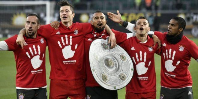لاعبو بايرن ميونيخ يحتفلون بفوزهم بدوري الدرجة الأولى الألماني لكرة القدم يوم السبت. تصوير: أندريس جبيرت – رويترز.