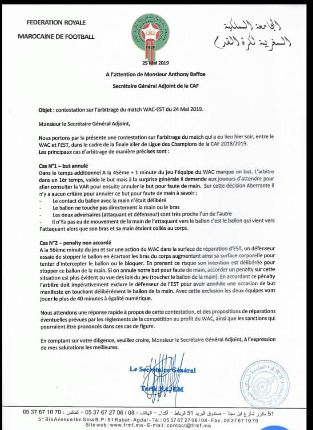 بعثت الجامعة الملكية المغربية لكرة القدم رسالة إلى الإتحاد الإفريقي لكرة القدم تحتج من خلالها على الحكم المصري جهاد جريشة اللذي قاد مباراة الوداد البيضاوي و الترجي التونسي في إطار نهائي عصبة الأبطال الإفريقية .