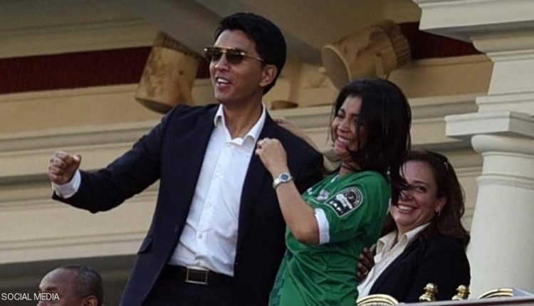 وظهر الرئيس الملغاشي الذي يبلغ 45 عاما، في حالة من الفرح العارم، إلى جانب زوجته، ميالي، عقب حسم التأهل إلى الدور ربع النهائي، في المباراة التي أقيمت على ملعب الاسكندرية.