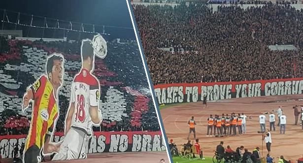 ورفعت جماهير الوداد الرياضي “تيفو” مع بداية المباراة، ثلاثي الأبعاد، تستحضر فيه لقطة تسجيل وليد الكرتي للهدف الذي أشعل فتيل الصراع في ملعب “رادس” بعد عدم احتسابه وعدم اللجوء لتقنية التحكيم بالفيديو للحسم في شرعية الهدف.