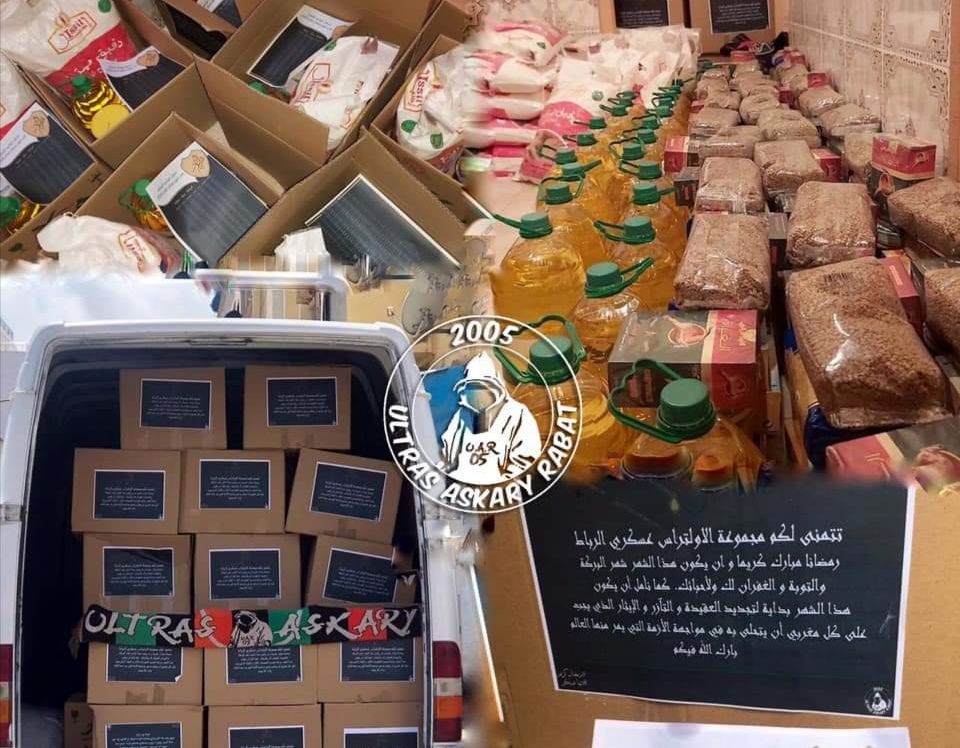 قام فصيل “أولتراس عسكري”، المساند للجيش الملكي، بمد يد العون للأسر الفقيرة والمعوزة المتضررة من توقف أنشطتها بسبب جائحة “كورونا”، وذلك تزامنا مع بداية شهر رمضان، في بادرة إنسانية وتضامنية.