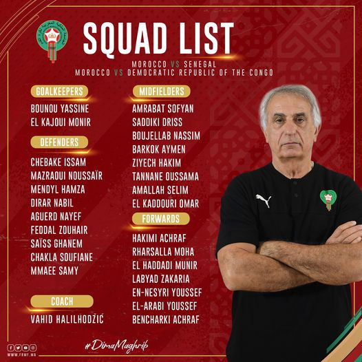 أعلن الناخب الوطني وحيد حاليلوزيتش، يومه الخميس فاتح أكتوبر، عن اللائحة النهائية للمنتخب الوطني الأول، الذي سيواجه وديا كلا من منتخبي السنغال والكونغو الديمقراطية استعدادا للاستحقاقات المقبلة.