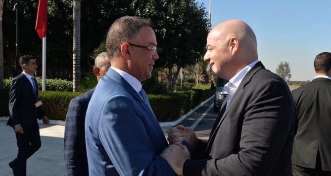 ووجد إنفانتينو في استقباله بمطار الرباط -سلا رئيس الجامعة الملكية المغربية لكرة القدم، فوزي لقجع.