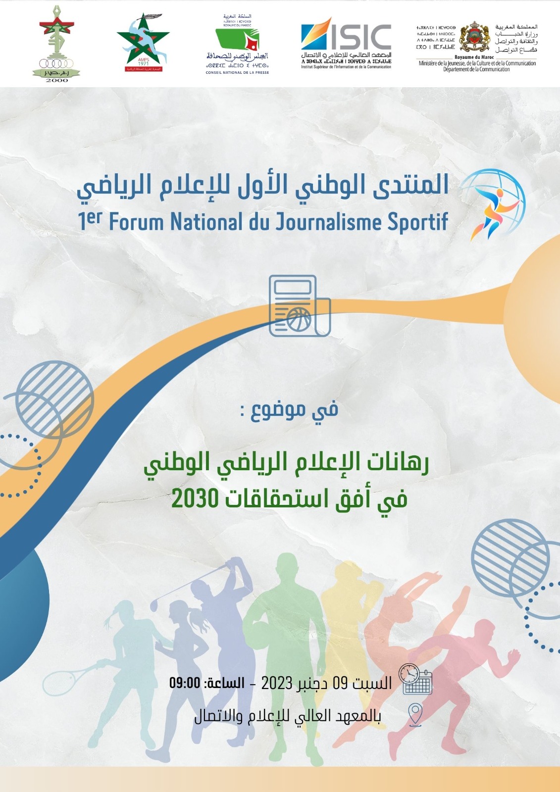 ينظم المعهد العالي للإعلام والاتصال والمجلس الوطني للصحافة والجمعية المغربية للصحافة الرياضية والرابطة المغربية للصحافيين الرياضيين بشراكة مع وزارة الشباب والثقافة والتواصل-قطاع التواصل،يوما خاص بالمنتدى الوطني الأول للإعلام الرياضي، عن محور : “رهانات الاعلام الرياضي الوطني في أفق استحقاقات2030”. وذلك يوم السبت 9 دجنبر2023 بالمعهد العالي للإعلام والاتصال في الساعة التاسعة والنصف صباحا.