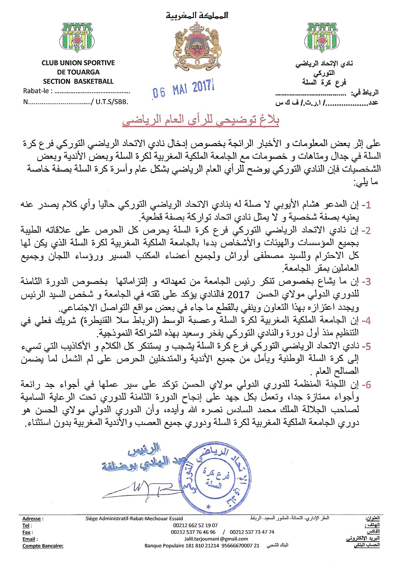 اتحاد تواركة لكرة السلة يصدر بلاغا للرأي العام .رياضة آخر تحديث مايو 6, 2017 مشاركة النسخة الكاملة لبلاغ نادي اتحاد تواركة لكرة السلة كما توصل به موقع سياسي: Facebook Twitter WhatsApp