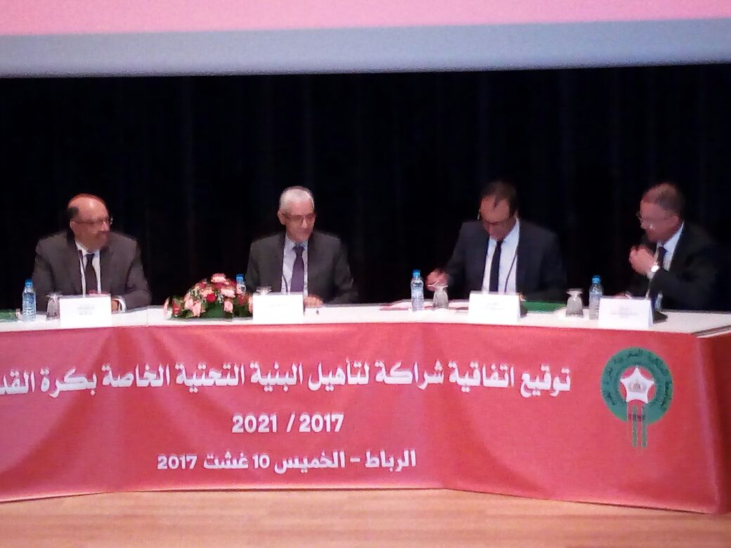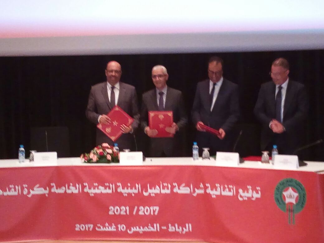 وقعت الجامعة الملكية المغربية لكرة القدم اتفاقية شراكة مع قطاعات حكومية، مساء يوم أمس الخميس بمدينة الرباط، وذلك قصد تأهيل البنية التحتية الخاصة بكرة القدم.