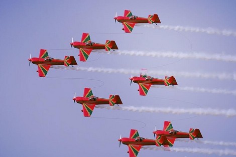 وافتتح العرض بحركة جماعية تسمى “حلقة عالية” تلتها حركة “انحراف صعودي إلى اليمين” ثم “حلقة منخفضة” و”مرور لإبداء الحبال” ثم “القنبلة” و”تقاطع بين الطائرات” و”الدوران مع الرجوع إلى الخلف” و “سيار العكسي” و”القلبة البهلوانية” و”تشكيلة الدوامة”.