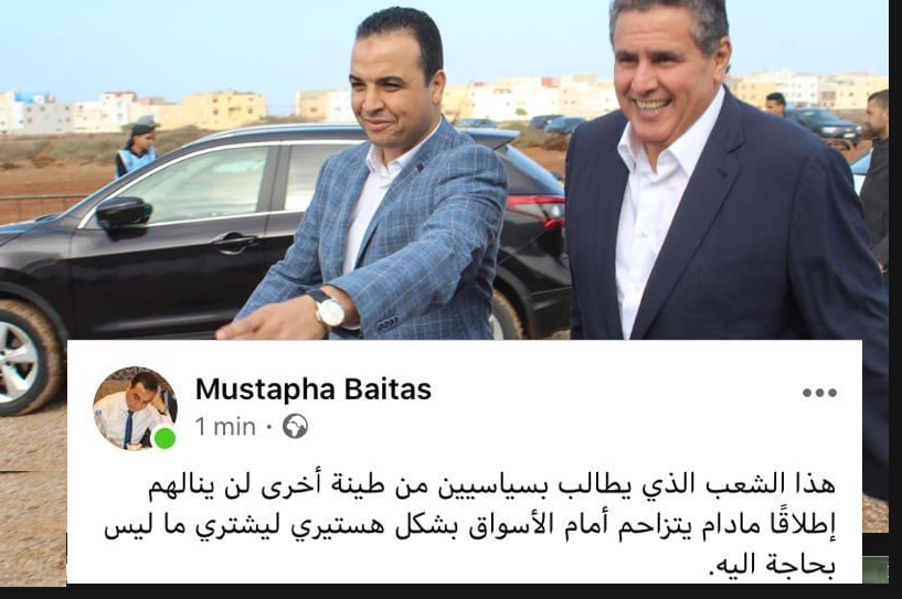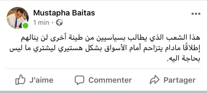 هذا ما كتبه النائب التجمعي مصطفى باتياس وعضو المكتب السياسي لذات الحزب، حيث كتب على حائطه الفايسبوكي”.. هذا الشعب الذي يطالب بسياسيين من طينة أخرى لن ينالهم إطلاقا مادام يتزاحم أمام الأسواق بشكل هستيري ليشتري ما ليس بحاجة إليه”.