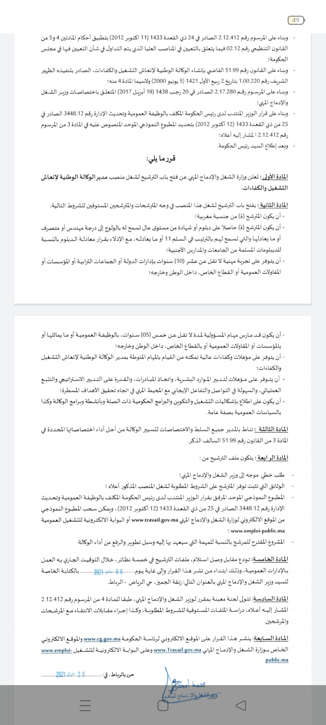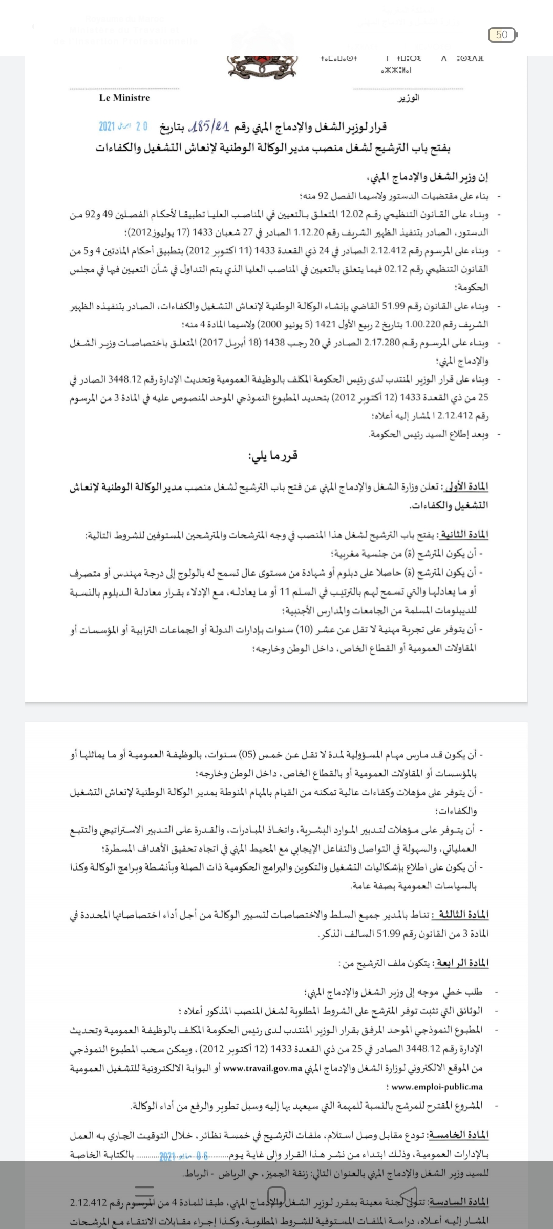 وثيقة: وزير التشغيل يعلن عن فتح باب الترشيح لمنصب مدير الوكالة الوطنية لإنعاش للتشغيل والكفاءات صحتك آخر تحديث أبريل 20, 2021 مشاركة اطلع على القرار nomFichier642 Facebook Twitter WhatsApp