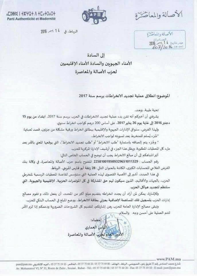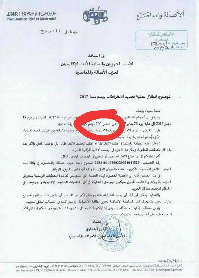ورغم ان البام خاض حملته الانتخابية البرلمانية بأموال فاقت التوقعات وأطلق حملة اشهارية واشترى مواقع واحدث صحف…الا ان مقدار 200درهم…يبقى هو المحدد الجديد الذي اختاره حزب الياس العماري لانخراط فيه.