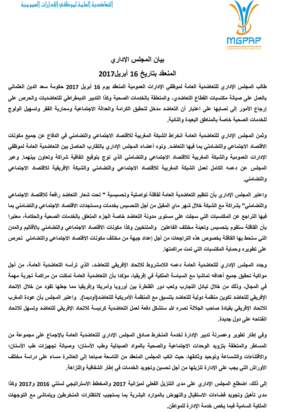 التعاضدية العامة لموظفي الإدارات العمومية : بيان المجلس الإداري المنعقد بتاريخ 16 أبريل2017 صحتك آخر تحديث أبريل 26, 2017 مشاركة Facebook Twitter WhatsApp