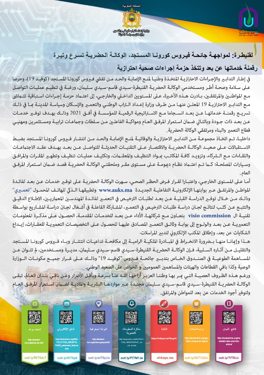 رغم هذه الظروف العصيبة التي يمر بها وطننا العزيز أزاحها الله عنا بسرعة وبأقل الأضرار وعن باقي بلدان العالم، يمكنني أن أؤكد لكم أن الوكالة الحضرية القنيطرة-سيدي قاسم-سيدي سليمان، إدارة ومسؤولين ومستخدمين مجندين لضمان استمرارية المرفق العام بتوفير أجود الخدمات عن بعد للمواطن وللمرتفق.