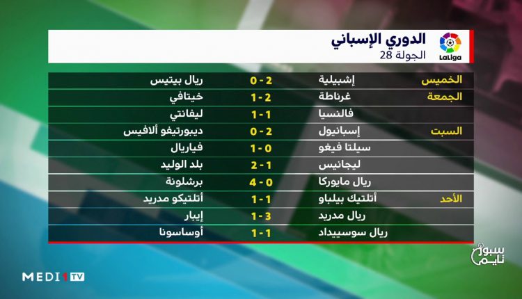 بطولة إسبانيا : النتائج والترتيب بعد مباريات الدورة الـ 28 فيديورياضةفيديو بتاريخ يونيو 15, 2020 مشاركة Facebook Twitter WhatsApp