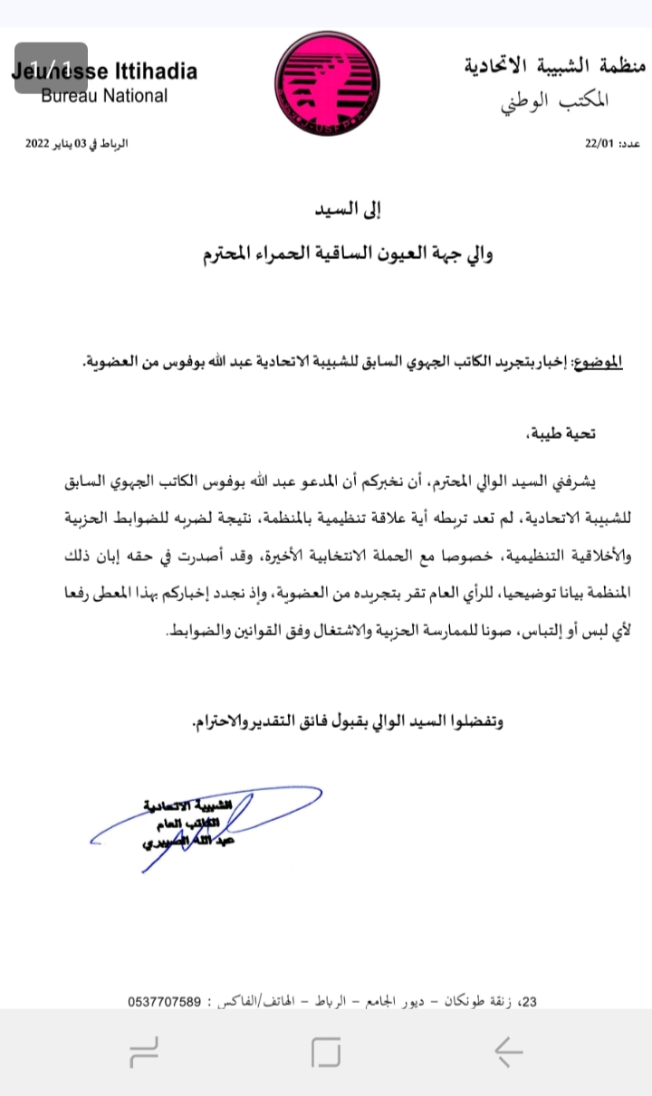 وبعد هذه الخرجة القوية للكاتب الجهوي للشبيبة الاتحادية بجهة العيون الساقية الحمراء، سارع الكاتب الوطني للشبيبة الاتحادية الى تجميد عضوية عبد الله بوفوس، حيث راسل عبد الله الصيباري والي جهة العيون الساقية الحمراء، وهو ما أثار سخط لدى اتحاديو الصحراء المغربية في تعاطي قيادة الحزب مع المواقف المعبر عنها من قبل بعض مناضلي حزب الوردة بالأقاليم الجنوبية، واللجوء الى ألية الطرد وتجميد العضوية مع كل المعارضين لقيادة الحزب اليوم، في حين يتطلب الأمر تدبير الاختلاف وتفعيل التواصل من أجل توسيع قاعدة حزب الاتحاد الاشتراكي للقوات الشعبية في الأقاليم الجنوبية واستقطاب شباب وكفاءات من هذه الأقاليم في الدفاع عن القضية الوطنية والمساهمة في تنزيل المشروع التنموي الجديد..