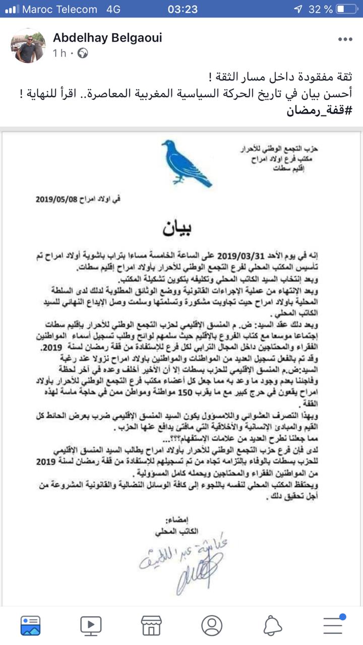 ماذا يقع في حزب التجمع الوطني للاحرار كما تظهر الوثيقة التي تنشرها “سياسي”… بتوجيه التهم للمنسق الإقليمي لحزب الحمامة بسطات بعدم وفاءه في توزيع القفة الرمضانية على ما اسموه للفقراء تم تسجيلهم بجماعة قروية تابعة بإقليم سطات وتم وعدهم بمنحهم القفة…