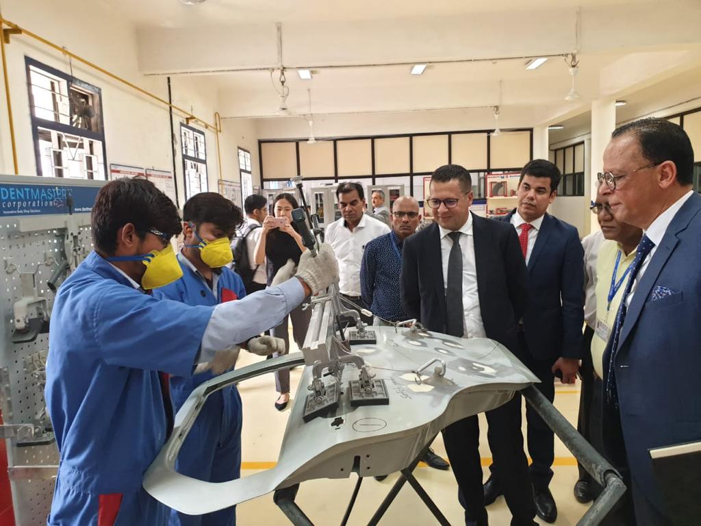 وفي هذا الصدد، قام كاتب الدولة اليوم بزيارة لمعهد التكوين الصناعي ITI ، الذي يعد من بين أفضل المعاهد الهندية، المختصة في تقديم تكوينات طويلة المدى وأخرى قصيرة المدى، في مجالات مهن السيارات والصناعات الميكانيكية والإلكترونية. باعتماد النموذج الألماني في التكوين الصناعي.