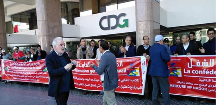 نظمت الكونفدرالية العامة للشغل، وقفة احتجاجية يوم الخميس 25 ابريل 2019 امام مقر صندوق الايداع والتدبير بسبب ما وصفته” التضييق على الحرية والممارسة النقابية و تعرض اعضاء المكتب النقابي للا ستفزازات والمضايقات عبر اتخاد اجراءات تأذيبية في حق بعضهم وتغيير ساعات العمل وترهيب العمال الكونفدراليين المنخرطين في صفوف الكونفدالية العامة للشغل لمغادرتها وفك انتماءهم والتحاق بنقابة اخرى مذللة من طرف مدير فندق ليدو السلام بالدارالبيضاء. ..”
