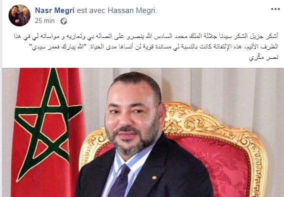 و كتب نصر ميكري على صفحته الفايسبوكية يقول : “أشكر جزيل الشكر سيدنا جلالة الملك محمد السادس الله ينصرو على اتصاله بي وتعازيه و مواساته لي في هذا الظرف الأليم، هذه الإلتفاتة كانت بالنسبة لي مساندة قوية لن أنساها مدى الحياة. “الله يبارك فعمر سيدي”.