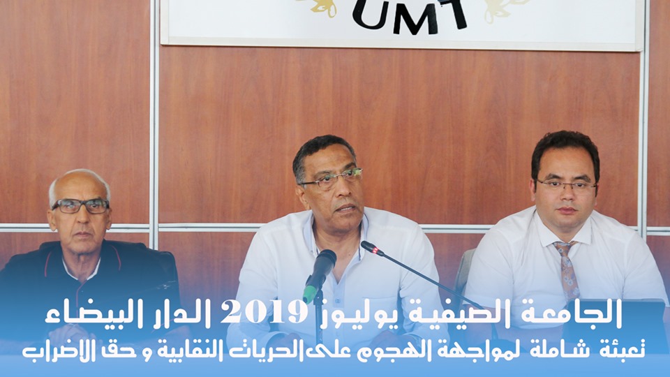 انطلقت، الجمعة 26 يوليوز 2019 بالدار البيضاء، أشغال الجامعة الصيفية، التي ينظمها الاتحاد المغربي للشغل موسم2019، تحت شعار”تعبئة  شاملة لمواجهة الهجوم على الحريات النقابية وحق الإضراب