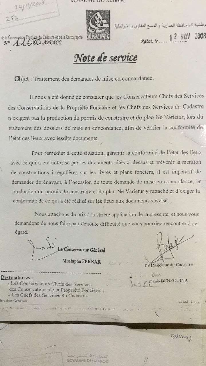 وهذه الشكاية وضحت كيف أن بعض” مدراء وكالة المحافظة العقارية، ورؤساء مصالح المسح العقاري، متهمين ” في إنشاء إتفاق عم المصالح المركزية والخارجية للوكالة إعتدوا به على أموال المواطنين وممتلكاتهم وحرموهم من حقوقهم المكفولة بالفصل 35 من الدستور. إذ حرموا المواطنين بالمذكرة 11680 من تحفيظ بناياتهم المشيدة فوق رسومهم العقارية حيث خلقوا بهذه المذكرة المشؤومة، العشوائية، والمنعدمة القانونية، مخالفة وهمية،