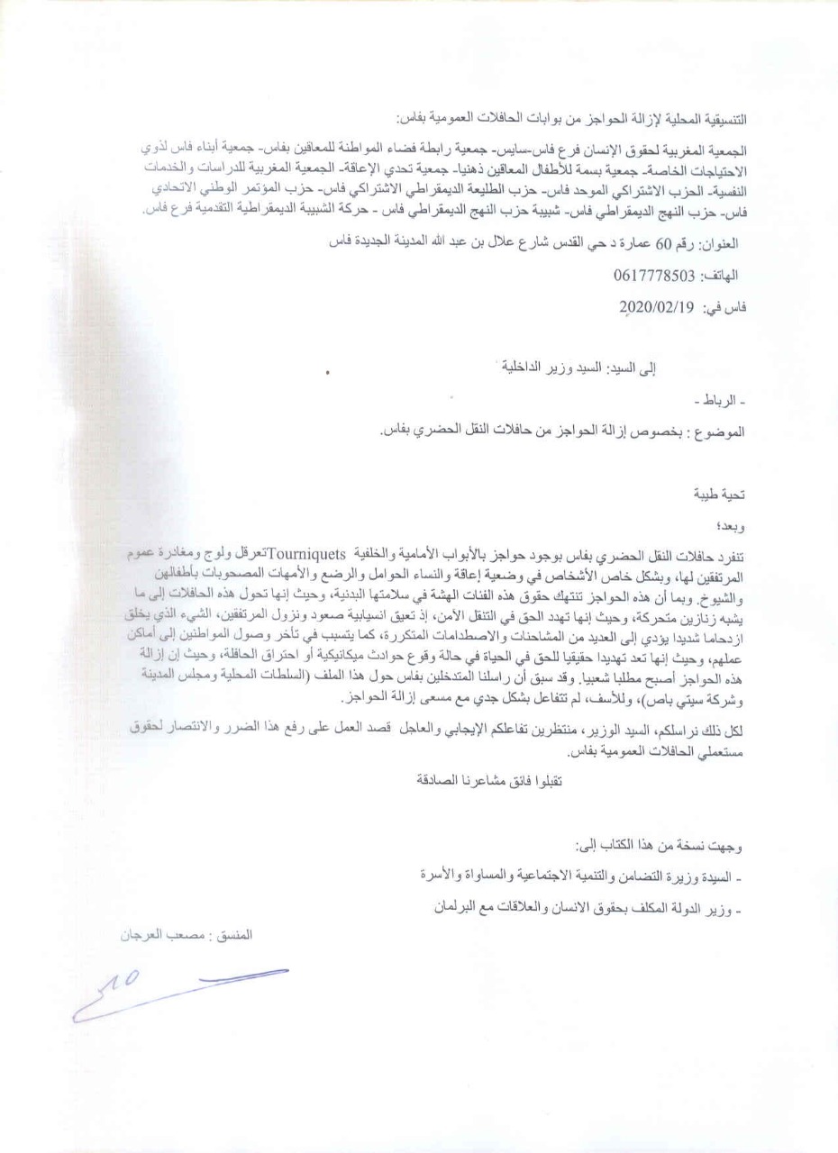 راسلت التنسيقية المحلية لإزالة الحواجز من بوابات الحافلات العمومية بفاس وزير الداخلية عبد الوافي لفتيت من أجل التفاعل الإيجابي والعاجل  قصد العمل على رفع هذا الضرر والانتصار لحقوق مستعملي الحافلات العمومية بفاس.