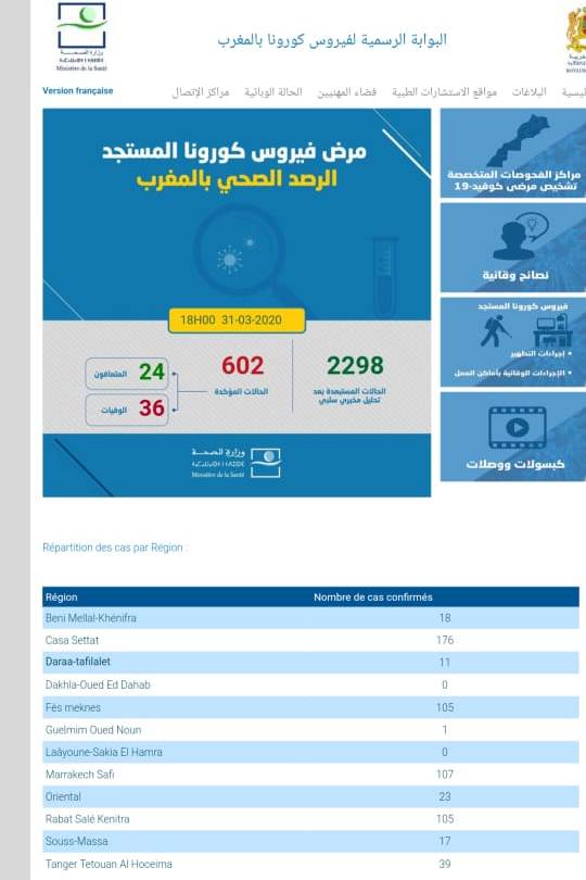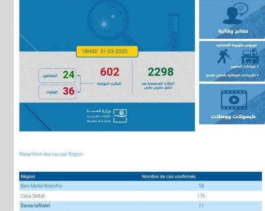 كورونا بالمغرب يترفع…..602 حالة إصابة و36 حالة وفاة