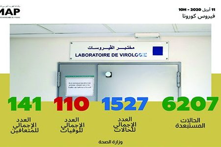 وأضافت الوزارة، على بوابتها الرسمية الخاصة بفيروس كورونا المستجد بالمغرب “www.covidmaroc.ma”، أن 19 حالة جديدة تماثلت للشفاء من المرض منذ السادسة من مساء أمس حتى الآن ، ليرتفع العدد الاجمالي لحالات الشفاء إلى 141 حالة، فيما بلغ عدد حالات الوفاة 110 . وبلغ عدد الحالات المستبعدة بعد تحليل مخبري سلبي 6207 حالة.