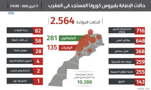 وأوضح مدير مديرية علم الأوبئة ومكافحة الأمراض بوزارة الصحة السيد محمد اليوبي، في تصريح نقلته وكالة المغرب العربي للأنباء مباشرة على قناتها “M24″، وإذاعتها “ريم راديو”، أنه تم تسجيل تماثل 32 حالة جديدة للشفاء ليرتفع عدد المتعافين من المرض حتى الآن إلى 281 شخصا، فيما تم تسجيل 5 حالات وفاة جديدة ليصل العدد الإجمالي للوفيات إلى 135 حالة إلى حدود الساعة.