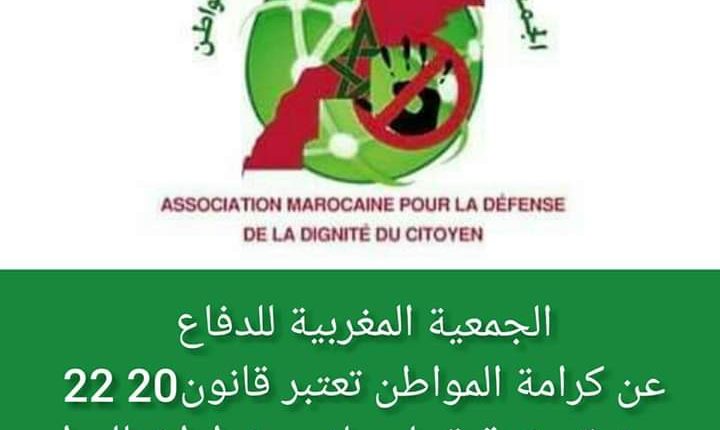 على اثر مشروع قانون 20_22 الذي اثار جدلا واسعا في الاوساط المغربية من لدن احزاب وطنية وفعاليات اعلامية ومدنية وحقوقية وغيرها،اصدرت الجمعية الوطنية للدفاع عن كرامة المواطن بيان للراي العام،توصلت الجريدة الالكترونية المستقلة(سياسي.كوم)بنسخة منه وهذا ماجاء فيه: