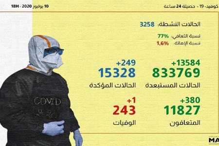 وأوضحت رئيسة مصلحة الأمراض الوبائية بمديرية علم الأوبئة ومكافحة الأمراض بالوزارة، السيدة هند الزين، في تصريح صحافي، أن الحصيلة الجديدة رفعت العدد الإجمالي لحالات الإصابة المؤكدة بالمملكة إلى 15 ألفا و328 حالة منذ الإعلان عن أول حالة في 2 مارس الماضي، ومجموع حالات الشفاء التام إلى 11 ألفا و827 حالة بنسبة تعاف تبلغ حوالي 77 في المائة، فيما ارتفع عدد الوفيات إلى 243 حالة بمعدل إماتة يناهز 1,6 في المائة.