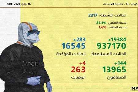 وأوضحت رئيسة مصلحة الأمراض الوبائية بمديرية علم الأوبئة ومكافحة الأمراض بالوزارة، هند الزين، في تصريح صحافي، أن الحصيلة الجديدة رفعت العدد الإجمالي لحالات الإصابة المؤكدة بالمملكة إلى 16 ألفا و545 حالة منذ الإعلان عن أول حالة في 2 مارس الماضي، ومجموع حالات الشفاء التام إلى 13 ألفا و 965 حالة بنسبة تعاف تناهز 84.4 في المائة، فيما ارتفع عدد الوفيات إلى 263 حالة بمعدل إماتة يناهز 1,6 في المائة.