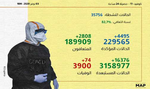 الرباط – أعلنت وزارة الصحة، اليوم الثلاثاء، عن تسجيل 4495 إصابة جديدة بفيروس كورونا المستجد (كوفيد-19)، و2808 حالات شفاء، و74 حالة وفاة خلال الـ24 ساعة الماضية.