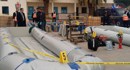 وأشار البلاغ إلى أن عمليات التفتيش المنجزة في إطار هذه القضية أسفرت عن حجز عشرة زوارق مطاطية من الحجم الكبير، و23 محركا بحريا، و150 كيلوغراما من مخدر الشيرا وثماني سيارات، وأربع لوحات ترقيم مزورة، وسبع حاويات للبنزين سعة كل واحدة 30 لترا، و6 بوصلات و20 مضخة هوائية، وما يناهز 1000 صدرية للنجاة، فضلا عن زيوت للمحركات وأسلحة بيضاء وألواح خشبية وقطع قماش وآلات للخياطة تدخل في حياكة وصناعة الزوارق المطاطية.