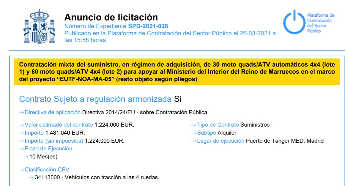 وهو عقد بقيمة 1.48 مليون أورو لشراء 90 سيارة رباعية الدفع من نوع  كواد خاصة بوزارة الداخلية المغربية ، وهي مخصصة بحسب تفسير الحكومة الاسبانية لمراقبة الحدود وتهريب البشر  و هي من دفعتين.
