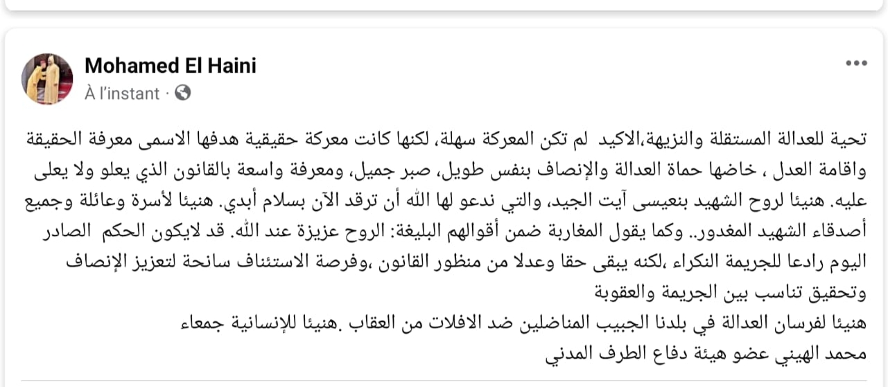 وأضاف الهيني في تدوينة له” هنيئا لروح الشهيد بنعيسى آيت الجيد، والتي ندعو لها الله أن ترقد الآن بسلام أبدي. هنيئا لأسرة وعائلة وجميع أصدقاء الشهيد المغدور.. وكما يقول المغاربة ضمن أقوالهم البليغة: الروح عزيزة عند الله. قد لايكون الحكم الصادر اليوم رادعا للجريمة النكراء ،لكنه يبقى حقا وعدلا من منظور القانون ،وفرصة الاستئناف سانحة لتعزيز الإنصاف وتحقيق تناسب بين الجريمة والعقوبة،،،هنيئا لفرسان العدالة في بلدنا الجبيب المناضلين ضد الافلات من العقاب .هنيئا للإنسانية جمعاء،،،” حسب قول محمد الهيني عضو هيئة دفاع الطرف المدني.