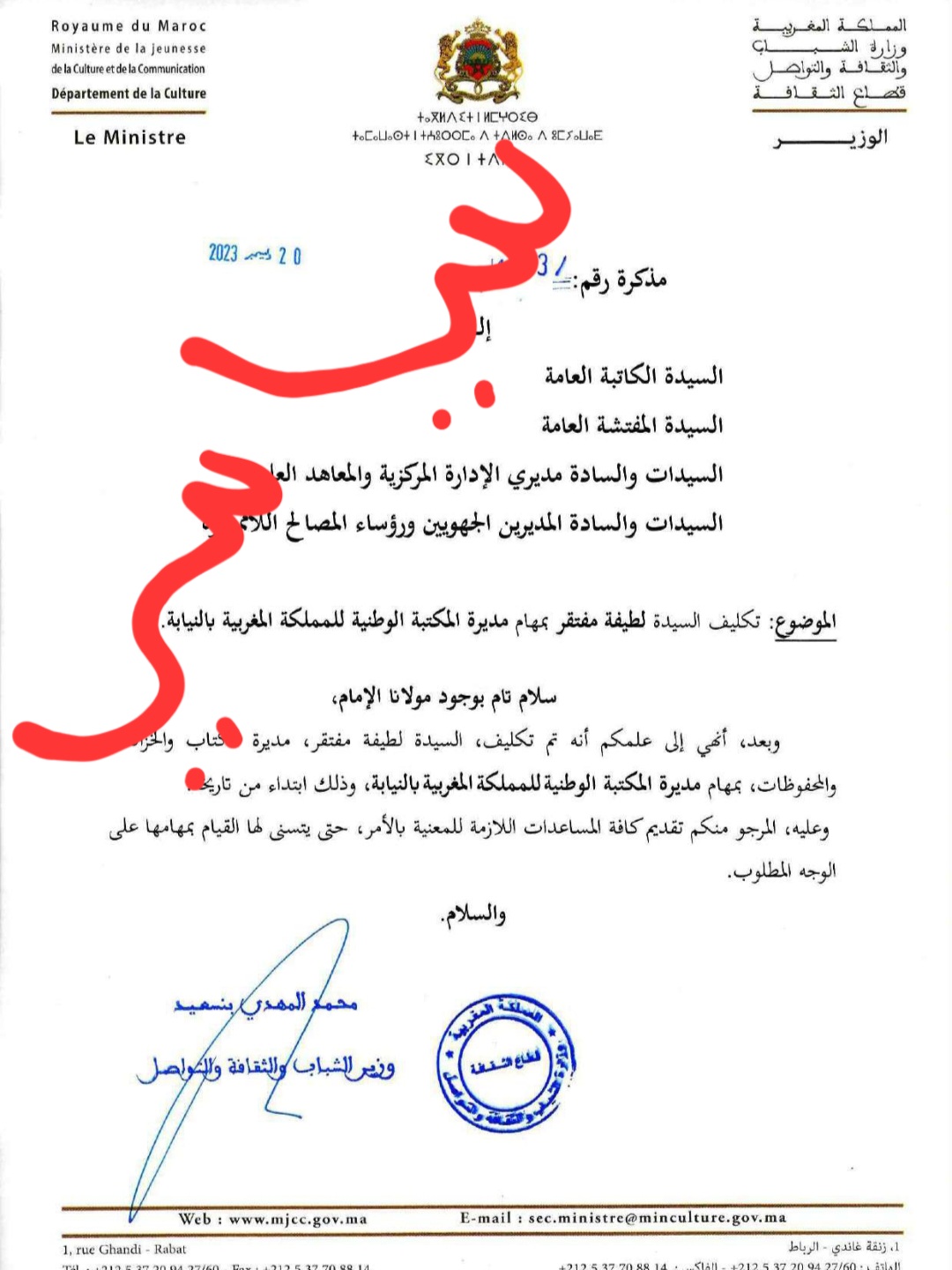 قام وزير الثقافة والشباب والتواصل المهدي بنسعيد، اليوم الأربعاء باعفاء مدير المكتبة الوطنية للمملكة المغربية محمد فران من مهامه، وكلف لطيفة مفتقر مديرة بالنيابة.