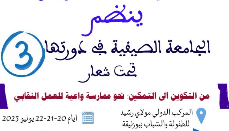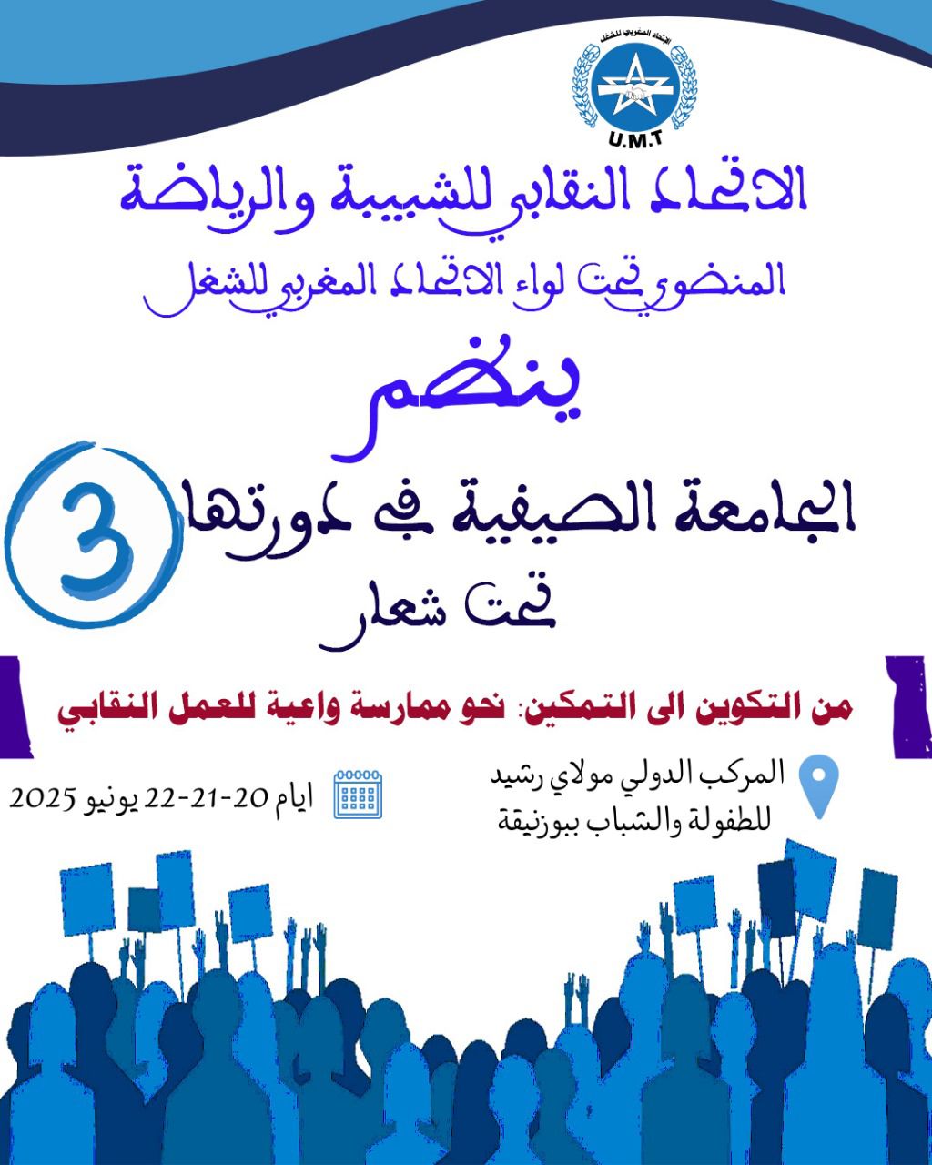 يُنظم الاتحاد النقابي للشبيبة والرياضة، التابع للاتحاد المغربي للشغل، دورته الثالثة للجامعة الصيفية أيام 20 إلى 22 يونيو 2025، وذلك بالمركب الدولي مولاي رشيد للطفولة والشباب ببوزنيقة، تحت شعار: “من التكوين إلى التمكين: نحو ممارسة واعية للعمل النقابي.”