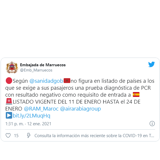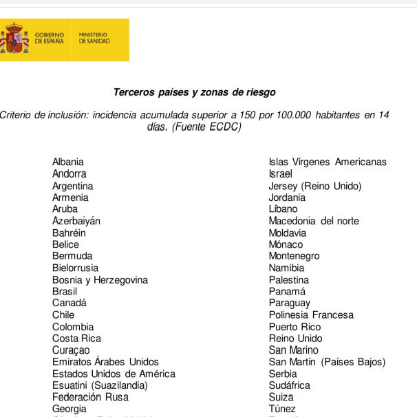 بإمكان المغاربة دخول التراب الاسباني دون اجراء فحوصات PCR مغاربة العالم آخر تحديث يناير 12, 2021 مشاركة اصدرت وزارة الصحة الاسبانية لائحة الدول و المناطق التي يتعين على مواطنيها اجراء فحوصات الكوفيد PCR قبل دخول التراب الاسباني. و لم يدرج المغرب ضمن هذه اللائحة المدرجة في الصورة اسفله Facebook Twitter WhatsApp اسبانياالمغرببيل ريال مدريدمغاربة